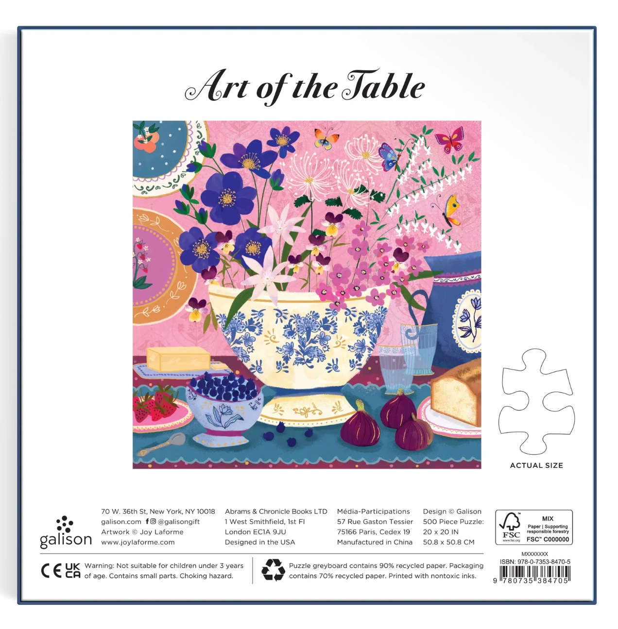 Indulge in the timeless beauty of still life with this exquisite 500-piece jigsaw puzzle featuring artwork by Joy Laforme, showcasing a porcelain vase overflowing with violets, surrounded by luscious figs and other delectable fruits. Each piece of this puzzle captures the delicate intricacies and vibrant colours of Laforme's masterful composition, inviting you to immerse yourself in the tranquil elegance of a floral tableau.
